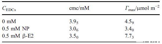 表 2 在含有 0.49 M Na2SO4 和 0.01 M H2SO4 的 5 mM hp-β-CD 存在下,HTA+ 溶液在不同 NP 或 β-E2 濃度下的 cmc 和表面過量 (Γmax) 值