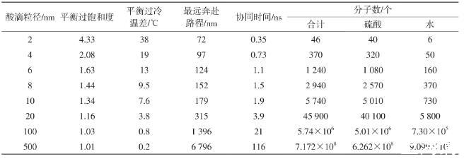 若冷凝酸初始粒徑為8 nm,由2 940個分子組成,平衡過飽和度1.44,酸滴表面飽和蒸氣壓增大44%,對應(yīng)的平衡過冷溫差9.5℃。在超額過飽和溫差10.5℃下,等于氣相過冷了約20℃,平衡過飽和度、超額過飽和度各半,此時酸滴中分子最遠奔赴路程150 nm,對應(yīng)的協(xié)同時間是1.5 ns,酸滴間最近距離是0.3μm。