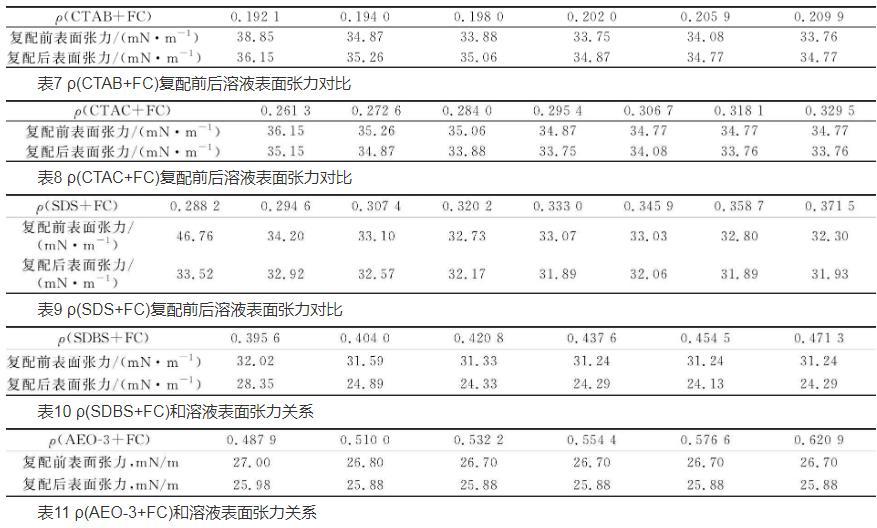 由表1可以得出FC質(zhì)量濃度為0.056 0 g/L時(shí)表面張力最低,以此為依據(jù)考察不同表面活性劑與FC協(xié)同作用。從表7~11可以看出:在FC質(zhì)量濃度均為0.056 0 g/L時(shí),隨著碳?xì)浔砻婊钚詣舛鹊脑黾?,?fù)配體系的表面張力逐漸下降然后趨于平衡。當(dāng)CTAB濃度為0.192 1 g/L時(shí),復(fù)配后較復(fù)配前下降3 mN/m;當(dāng)CTAC濃度為0.261 3 g/L時(shí),復(fù)配后較復(fù)配前下降1 mN/m;當(dāng)SDS濃度為0.288 2 g/L時(shí),復(fù)配后較復(fù)配前下降14 mN/m;當(dāng)SDBS濃度為0.395 6 g/L時(shí),復(fù)配后較復(fù)配前下降了4 mN/m;當(dāng)AEO-3濃度為0.487 9 g/L時(shí),復(fù)配后較復(fù)配前下降了近1 mN/m。由此可見:氟碳與碳?xì)浔砻婊钚詣?fù)配后,溶液的表面活性相對增強(qiáng),表面張力明顯降低,依次為SDBS>AEO-3>SDS>CTAC>CTAB。