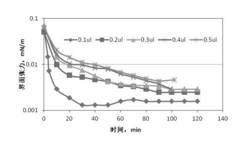 圖3、圖4是根據(jù)前述實(shí)驗(yàn)步驟1、2提供的配置與測(cè)量方法,油滴注入量分別為0.1μL、0.2μL、0.3μL、0.4μL、0.5μL,無(wú)堿二元驅(qū)配方體系與高凝油間界面張力的關(guān)系曲線。從圖2可知:無(wú)堿二元驅(qū)配方體系與高凝油間的界面張力達(dá)到超低界面張力的時(shí)間隨著油滴注入量的增多明顯延長(zhǎng),注入油滴0.1μL,4分鐘達(dá)到超低界面張力,注入油滴0.5μL,40分鐘達(dá)到超低界面張力;從圖4可知:注入油滴量大于0.3μL以后,對(duì)無(wú)堿二元驅(qū)配方體系與高凝油間界面張力的測(cè)定不能持續(xù)2小時(shí),油滴在100分鐘發(fā)生斷開(kāi),對(duì)于高凝油而言,油滴注入量小于0.3μL較適合。