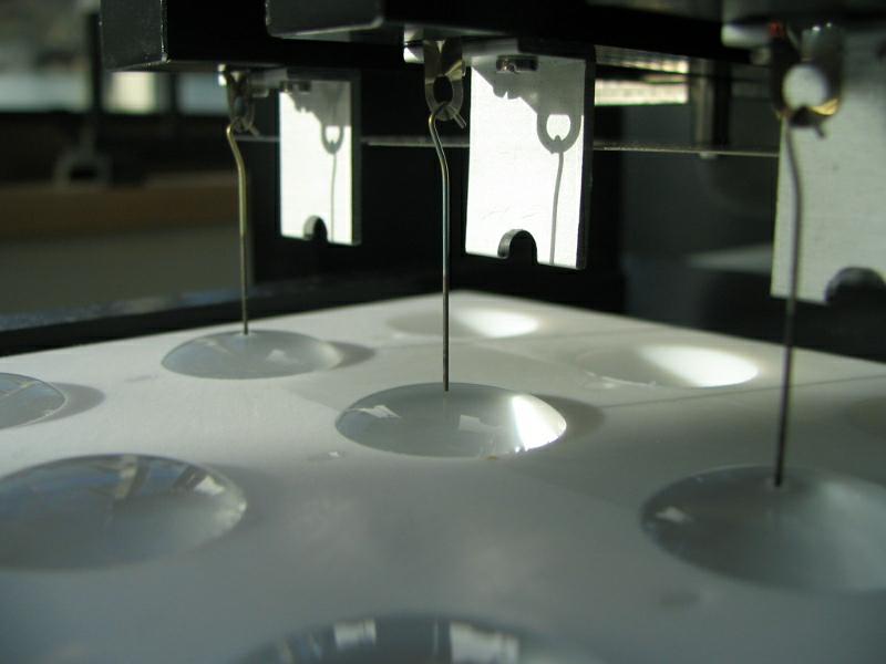 為了給用戶提供最為精確的表面張力/表面壓力,Kibron發(fā)展了一種新的精度超過0.2微克的微量天平,這種靈敏度與“最大拉力”原理相結(jié)合進行測量。測量時先將一個探針浸入到界面,然后慢慢拔出,記錄彎液面(粘附在探針上的液面)的重量,該重量用于計算表面張力。